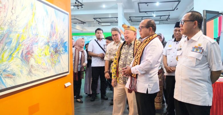 Pj Gubernur Lampung didampingi Kepala Disdikbud dan Kepala Taman Budaya, saat meninjau pameran lukisan pada kegiatan Pekan Kebudayaan Daerah Lampung 2024, di Taman Budaya, Rabu, 16 Oktober 2024. ISTIMEWA