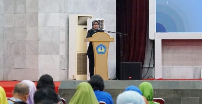 Rektor Unila Prof. Dr. Ir. Lusmeilia Afriani, D.E.A., I.P.M, memberikan sambutan pada kegiatan pembekalan penanggung jawab lokasi dan pengawas UTBK-SNBT, di Gedung Serbaguna Unila, Kamis, 4 Mei 2023. ISTIMEWA