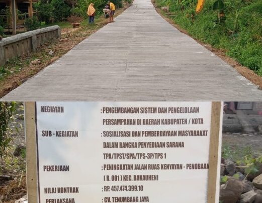 SMARTNEWS.ID — Pembangunan peningkatan ruas jalan menggunakan rabat beton didusun Kenyayan-Penobaan Desa Bakauheni, Kecamatan Bakauheni, Lampung Selatan, telah selesai dikerjakan. Dimana, pembangunan rabat beton itu menghabiskan dana Rp 457.474.399.10. Selasa (08/08/2023)