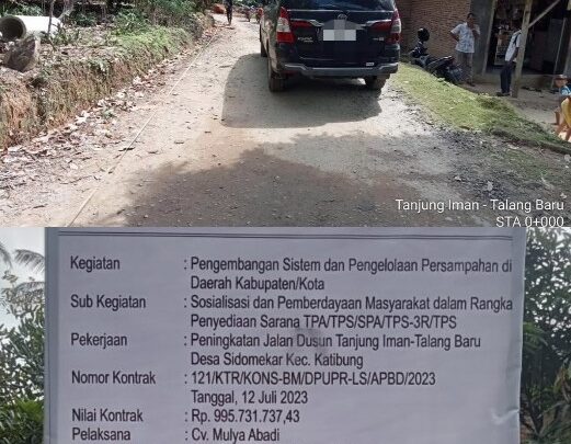 Berdasarkan informasi yang diketahui, pengerjaan jalan rabat beton sepanjang 900 meter dengan lebar 3 meter itu, akan dilaksanakan dan dikerjakan oleh pihak rekanan melalui CV. Mulya Abadi dengan nomor kontrak 121/KTR/KONS-BM/DPUPR-LS/APBD/2023. Sementara, untuk nilai kontrak peningkatan jalan rabat beton itu sekitar Rp 995.731.737.43, dengan waktu pengerjaan peningkatan jalan itu 90 hari.