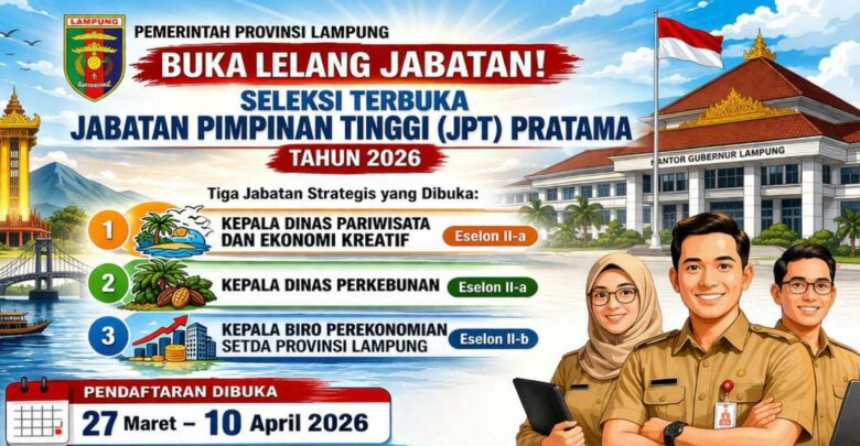 SMARTNEWS.ID – Pemerintah Provinsi Lampung resmi membuka seleksi terbuka pengisian tiga Jabatan Pimpinan Tinggi (JPT) Pratama tahun 2026, membuka peluang bagi aparatur sipil negara (ASN) berkompeten untuk menembus posisi strategis di level pengambil kebijakan.