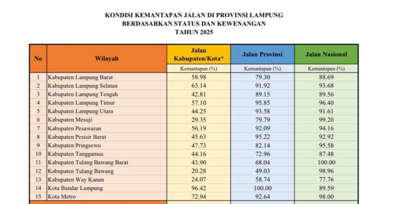 Data 2025 juga menunjukkan kondisi jalan provinsi relatif mantap di hampir seluruh wilayah. Beberapa daerah mencatat angka tinggi, di antaranya Lampung Timur 95,85 persen, Pesisir Barat 95,22 persen, Lampung Utara 93,58 persen, Pesawaran 92,09 persen, Lampung Selatan 91,92 persen, Kota Bandar Lampung 100 persen, dan Kota Metro 92,64 persen.