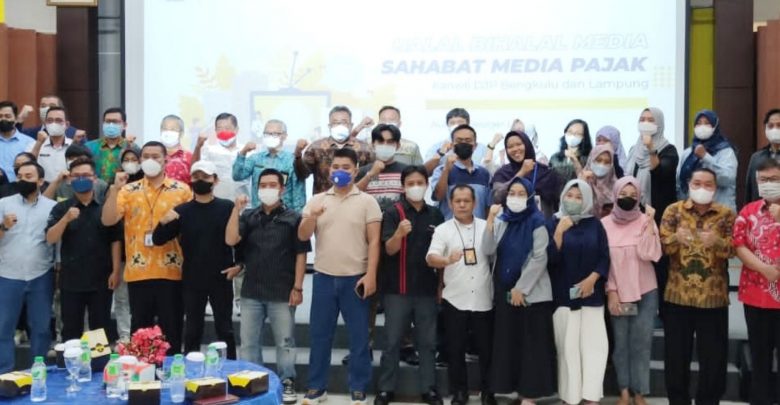 Kepala Kanwil DJP BeLa Tri Bowo, mengabadikan momen pada halal bihalal dan public hearing DJP Bengkulu-Lampung dengan awak media Lampung, di Kantor Kanwil DJP BeLa, Rabu (25/5/2022). ISTIMEWA
