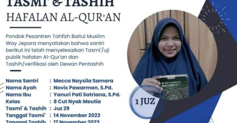 SMARTNEWS.ID – Siswi Sekolah Menengah Pertama (SMP) Islam Terpadu (IT) Baitul Muslim, Way Jepara, Lampung Timur, Mecca Naysila Samara, berhasil menghafal Alquran Juz 26, 27, 28, 29, 30.