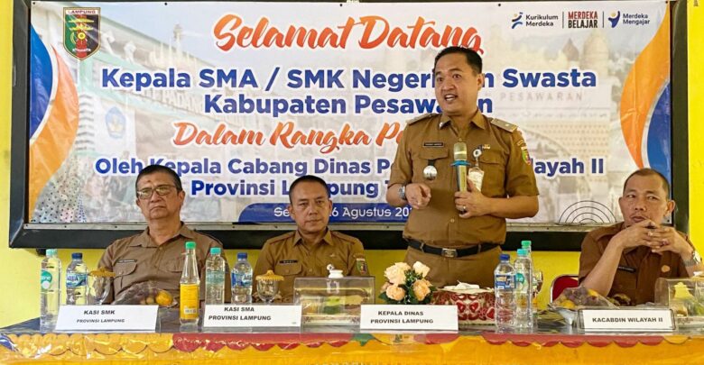 SMARTNEWS.ID – Kepala Dinas Pendidikan dan Kebudayaan Provinsi Lampung, Thomas Amirico, S.STP., S.H., melaksanakan kegiatan pembinaan bagi seluruh kepala sekolah jenjang SMA/SMK negeri dan swasta se-Kabupaten Pesawaran. Kegiatan berlangsung di SMAN 1 Padang Cermin, Kabupaten Pesawaran, pada Selasa, 26 Agustus 2025.