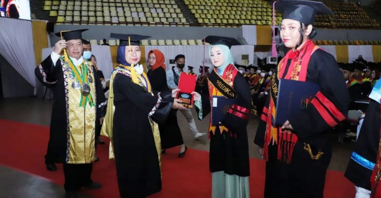 Rektor Unila, Prof. Dr. Ir. Lusmeilia Afriani, D.E.A., I.P.M, memberikan cendera mata kepada salah satu lulusan terbaik Unila, pada wisuda periode ke-3 tahun akademik 2022/2023, di GSG Unila, Sabtu, 21 Januari 2023. ISTIMEWA