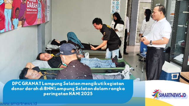 SMARTNEWS.ID – Anggota dan pengurus Dewan Pimpinan Cabang (DPC) Gerakan Nasional Anti Narkotika (Granat) Lampung Selatan melaksanakan kegiatan donor darah di Badan Narkotika Nasional (BNN) Lampung Selatan. Kegiatan donor darah yang dilaksanakan dalam rangka Hari Anti Narkoba Internasional (HANI) 2025, Rabu, 18 Juni 2025