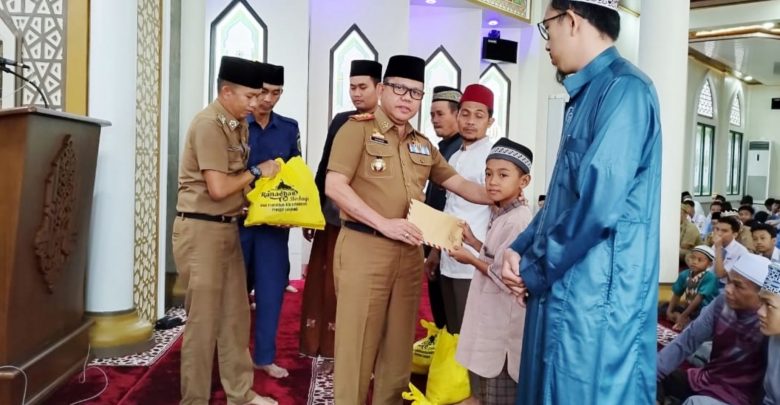 Kepala Disdikbud Lampung, Drs. Hi. Sulpakar, M.M, memberikan santunan kepada salah satu anak, pada peringatan Nuzulul Quran 1444 Hijriah/ 2023 Masehi, di Masjid Iqra lingkungan dinas setempat, Senin, 10 April 2023. ISTIMEWA