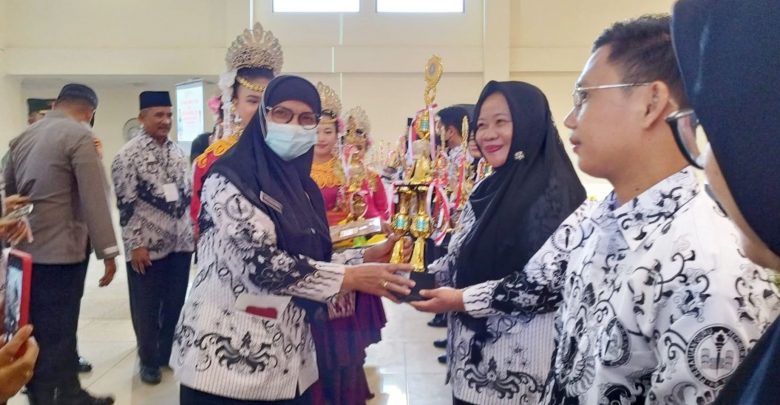 Kepala Disdikbud sekaligus Pembina PGRI Kota Bandar Lampung, Hj. Eka Afriana, S.Pd, menyerahkan piala kepada salah satu pemenang lomba pada HUT ke-77 PGRI dan HGN 2022, di GSG Karya Bakti Kwartir Cabang Pramuka, Rajabasa, Bandar Lampung, Rabu (30/11/2022). ISTIMEWA