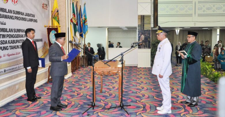 SMARTNEWS.ID – Penjabat (Pj) Gubernur Lampung Samsudin melantik sekaligus mengambil sumpah jabatan Ferli Yuledi sebagai Pj Bupati Tulang Bawang, di Balai Keratun Lantai III Kantor Gubernur Lampung, Sabtu, 10 Agustus 2024.