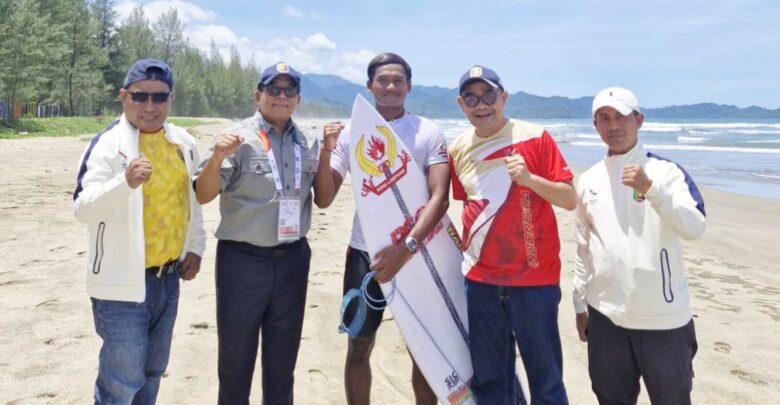 SMARTNEWS.ID – Penjabat (Pj) Gubernur Lampung Samsudin memberi menyemangati dan memotivasi empat atlet Lampung yang ikut cabang olahraga selancar ombak saat berkunjung langsung ke venue cabang olahraga selancar ombak PON XXI 2024, di Pantai Babah Kuala Lhoknga/ Pantai Riting, Kabupaten Aceh Besar, Provinsi Aceh, Selasa, 10 September 2024.