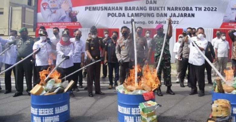 SMARTNEWS.ID – Polda Lampung musnahkan barang bukti narkoba berupa sabu dan ganja senilai Rp 271,8 miliar. Pemusnahan barang tersebut hasil tangkapan selama tiga bulan, periode Januari hingga Maret 2022.