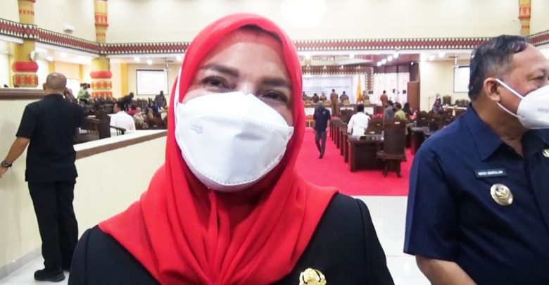 Wali Kota Bandar Lampung, Eva Dwiana, saat diwawancarai awak media terkait PTM 100 persen, usai menghadiri rapat paripurna di Gedung DPRD Kota Bandar Lampung, Selasa (10/5/2022). ISTIMEWA