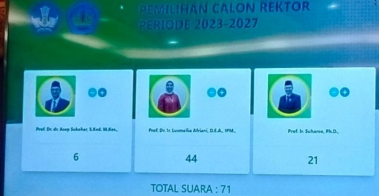 Pada pemilihan rektor yang diikuti tiga kandidiat tersebut, Prof Lusmeilia Afriani meraih 44 suara. Kemudian disusul Prof Suharso memperoleh 21 suara dan Prof Asep Sukohar dengan 6 suara.