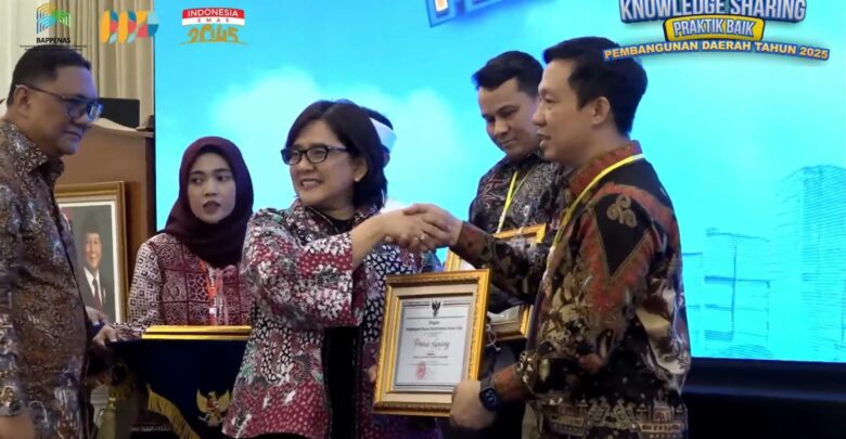 Penghargaan Pembangunan Daerah Tahun 2025 diterima oleh Gubernur Lampung Rahmat Mirzani Djausal yang diwakili oleh Sekretaris Daerah Provinsi Lampung, Marindo Kurniawan, pada kegiatan Knowledge Sharing Praktik Baik Pembangunan yang diselenggarakan di Kantor Kementerian PPN/Bappenas Republik Indonesia, Jakarta, Senin, 15 Desember 2025. (***)