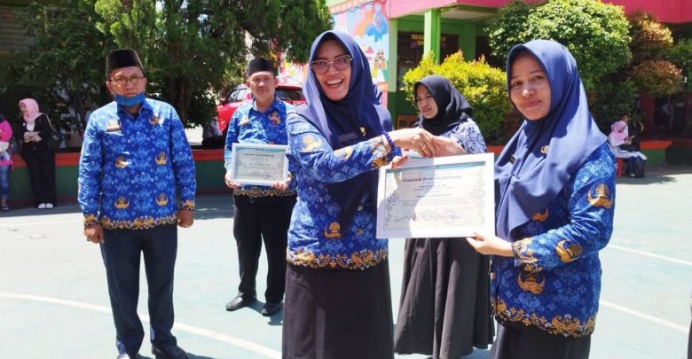 Kepala SDN 1 Palapa, Kusrina, M.Pd, menyerahkan piagam penghargaan kepada salah satu guru berprestasi pada puncak perayaan HGN dan HUT ke-77 PGRI, di sekolah setempat, Selasa (29/11/2022). ISTIMEWA