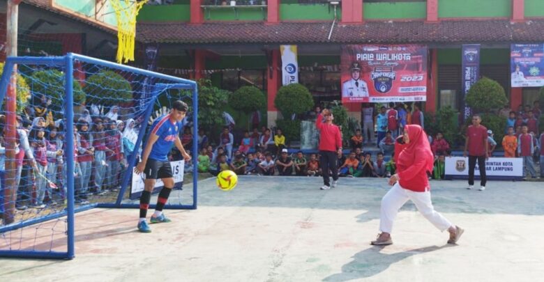 Kepala SMPN 16 Bandar Lampung, Nuryah Indarwati, S.Pd, menendang bola ke arah gawang sebagai tanda bahwa roadshow futsal Piala Wali Kota Bandar Lampung 2023, resmi dimulai, Jumat, 18 Agustus 2023. DOK SEKOLAH
