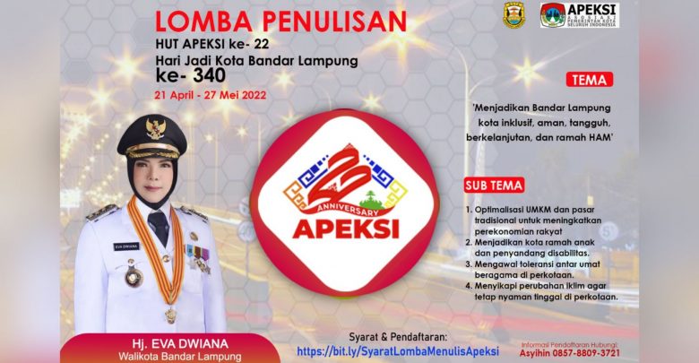 SMARTNEWS.ID – Pemerintah Kota Bandar Lampung menggelar lomba penulisan dalam menyambut Hari Ulang Tahun (HUT) ke-22 Asosiasi Pemerintah Kota (Apeksi) mulai 21 April – 8 Mei 2022. Lomba ini untuk memeriahkan pertemuan wali kota se-Indonesia yang berlangsung di Bandar Lampung pada 27-29 Mei 2022.
