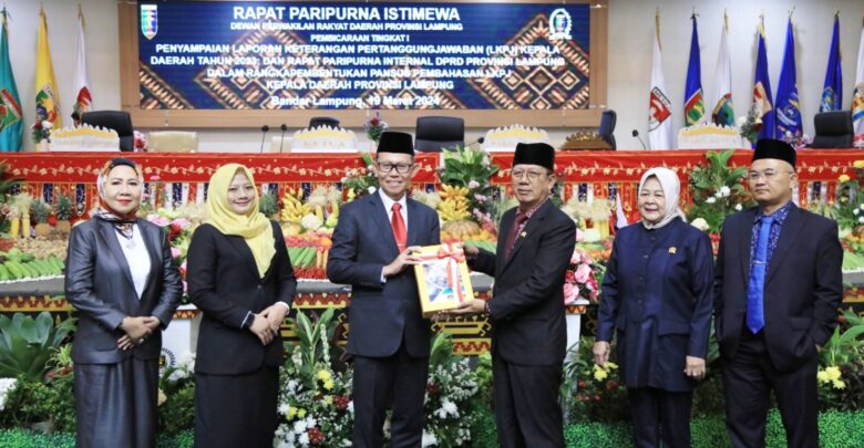 SMARTNEWS.ID – Sekretaris Daerah Provinsi Lampung Fahrizal Darminto menyerahkan Laporan Keterangan Pertanggungjawaban (LKPJ) Kepala Daerah Provinsi Lampung Tahun 2023 kepada Ketua DPRD Lampung Mingrum Gumay, dalam Rapat Paripurna Istimewa Dewan Perwakilan Daerah (DPRD) Provinsi Lampung, Selasa, 19 Maret 2024.
