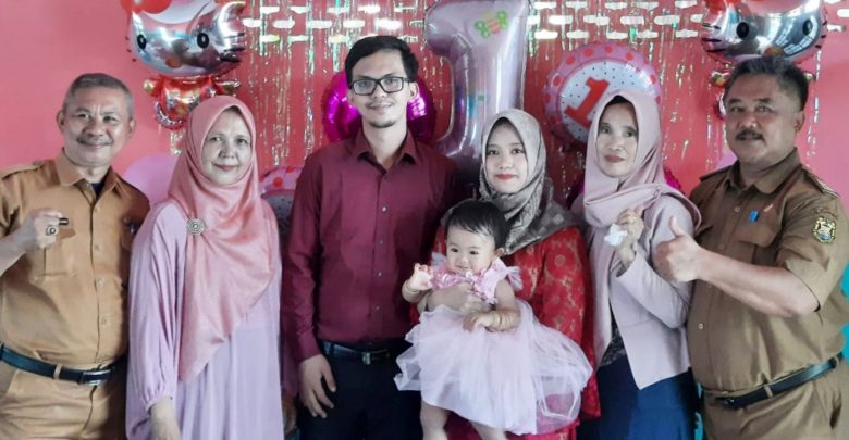 Nayla Rizki Azzahra (digendong ibundanya), mengabadikan momen bersama ayah, ibu, kakek, dan neneknya, pada perayaan hari ulang tahun ke-1, Senin siang (25/10/2021). ISTIMEWA