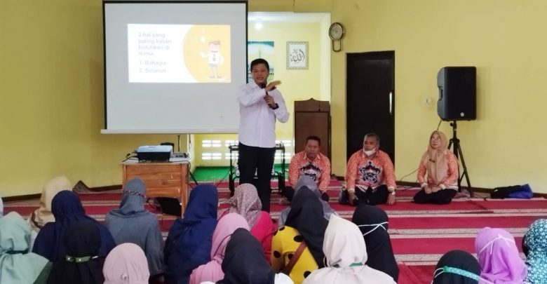 Motivator Pendidikan, Hasan Ashari, S.E., CT.NNLP, didampingi Kepala SMPN 3 Bandar Lampung, Nasib Utomo, M.Pd, saat memberikan motivasi terhadap orangtua siswa tentang pentingnya pola asuh yang baik kepada anak, di sekolah setempat, Kamis, 27 Oktober 2022. DOK SEKOLAH