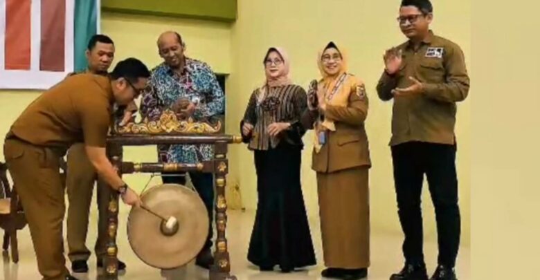 Kepala Bidang Pembinaan SMA Disdikbud Lampung, Azah Rawan Sangun, S.Psi, memukul gong sebagai tanda resmi diluncurkannya program Bank Sampah di SMAN 2 Bandar Lampung. DOK SEKOLAH