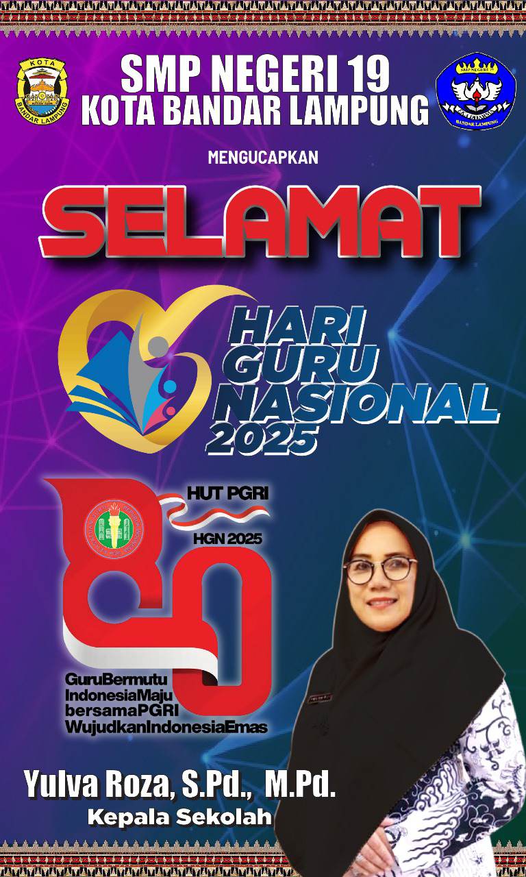 PGRI & HGN SMPN 19 Bandar Lampung Mengucapkan Selamat HUT Ke-80 PGRI & HGN 2025 22 November 2025 0 Less than a minute SMPN 19 Bandar Lampung Mengucapkan Selamat HUT Ke-80 PGRI & HGN 2025