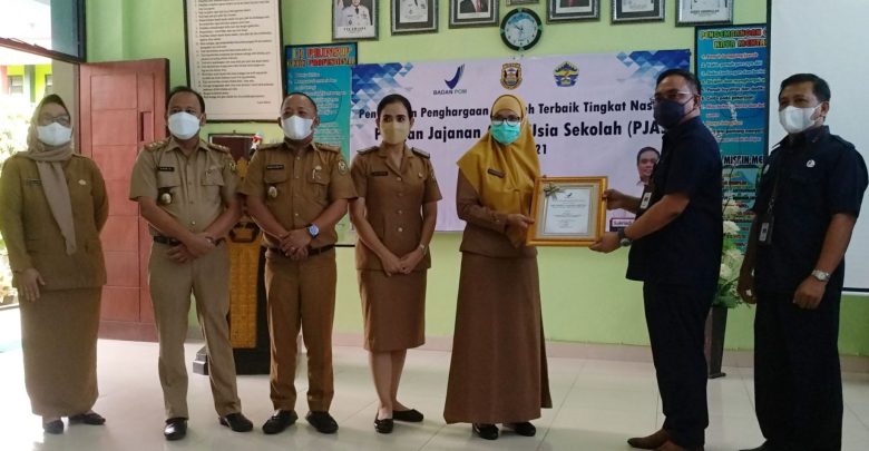 Kepala BBPOM di Bandar Lampung, Sukriadi Darma mewakili Kepala BPOM RI, Peny K Lukito, menyerahkan penghargaan BPOM RI kepada Plt. Kepala Disdikbud Bandar Lampung, Eka Afriana, mewakili Wali Kota Bandar Lampung Eva Dwiana, di SMPN 7 Bandar Lampung, Senin (22/11/2021).