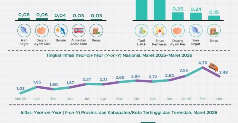 SMARTNEWS.ID – Perkembangan Indeks Harga Konsumen (IHK) pada Maret 2026 menunjukkan tren inflasi yang tetap terkendali, baik di tingkat nasional maupun daerah. Data resmi yang dirilis Badan Pusat Statistik mencatat inflasi bulanan (month-to-month) sebesar 0,41 persen, inflasi tahun kalender (year-to-date) sebesar 0,94 persen, dan inflasi tahunan (year-on-year) sebesar 3,48 persen.