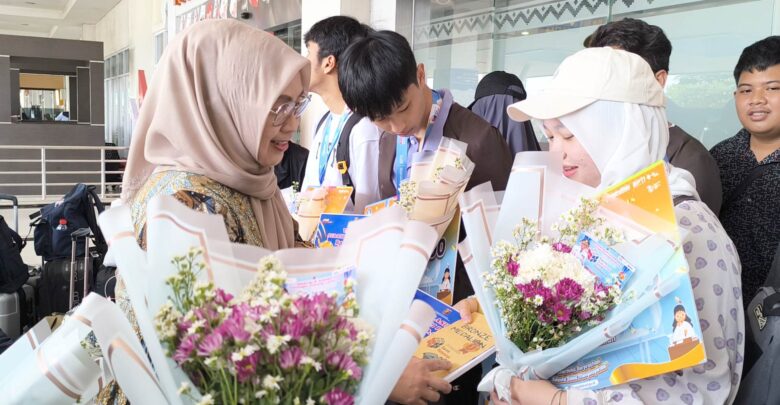 Seperti diketahui, penyambutan kontingen OSN di depan pintu kedatangan bandara, Kabid PSMA Disdikbud Lampung tampak memberikan bunga segar kepada para kontingen tersebut.