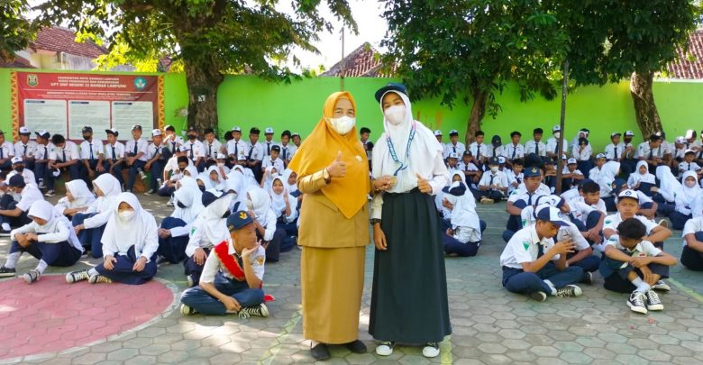 Syaira Fadia Putri, mengabadikan momen bersama Plt Kepala SMPN 33 Bandar Lampung, Dra. Elida Rais, M.Pd, dan siswa lainnya, di sekolah setempat, Senin (21/11/2022). DOK SEKOLAH