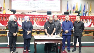 ISTIMEWA SMARTNEWS.ID – Penjabat (Pj) Gubernur Lampung Samsudin bersama Ketua Dewan Perwakilan Rakyat Daerah (DPRD) Lampung Mingrum Gumay, menandatangani persetujuan…