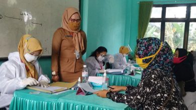 Kepala SMPN 5 Bandar Lampung Elly Yanti, S.Pd., M.M.Pd, saat menyaksikan vaksinasi yang diikuti salah satu pelajar, di aula sekolah…