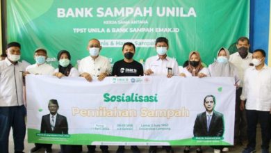 Sivitas akademika Unila dan jajaran emak.id, mengabadikan momen bersama pada kegiatan sosialisasi pemilahan sampah bersama bank sampah emak.id, di Aula TPST Unila,…