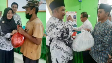 Ketua PGRI Kota Bandar Lampung, Drs. Yuni Herwanto, M.Pd (foto kanan) simbolis menyerahkan paket sembako kepada yang membutuhkan dalam rangka…