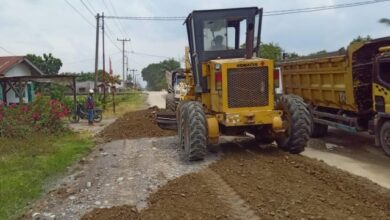 Sejumlah alat berat mulai diturunkan oleh PT.HKI untuk melaksanakan perbaikan jalan Protokol Kecamatan Wampu, Kabupaten Langkat, Sunatera Utara, sepanjang 7…