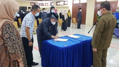 Kepala Disdikbud Lampung, Drs. Sulpakar, M.M (kanan), menyaksikan penandatanganan surat pelantikan yang dilakukan salah satu kepala sekolah. ISTIMEWA SMARTNEWS.ID —…
