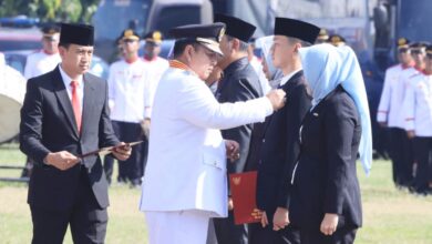 Gubernur Arinal menyematkan anugerah tanda kehormatan Satya Lencana Karya Satya kepada enam pegawai negeri sipil yang telah berbakti selama 10,…