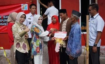 Ketua Tim Penggerak PKK Kabupaten Lampung Selatan Winarni Nanang Ermanto, saat memberikan kunci rumah dan meresmikan rumah layak huni milik…