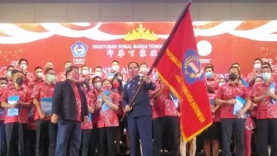 Ketua PSMTI Lampung, Christian Chandra, S.Sos., S.H., M.M mengibarkan bendera PSMTI saat pelaksanaan pelantikan dan pengukuhan pengurus PSMTI dan Perwanti…
