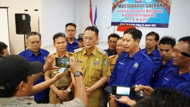 Pj Bupati Pringsewu Adi Erlansyah, didampingi pengurus dan anggota FKWKP, menjawab pertanyaan awak media pada musda FKWKP, di Aula Paris,…