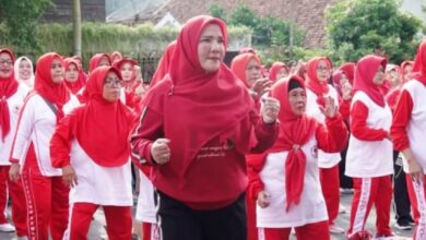 Wali Kota Bandar Lampung, Eva Dwiana, saat mengikuti senam bersama masyarakat dalam rangka perayaan HKN, di Taman UMKM Bung Karno,…