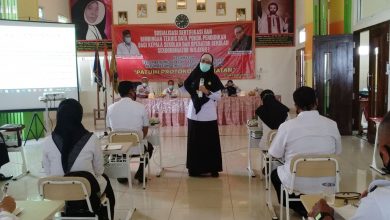 Sekretaris Disdikbud Eka Afriana, S.Pd., M.Si (berdiri), saat membuka sosialisasi Sertifikasi dan bimtek Dapodik, di SD Negeri 1 Rawa Laut,…