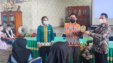 Kepala SMAN 9 Bandar Lampung Drs. Suharto, M.Pd (kanan), saat menerima cendera mata dari Divisi Layanan Internasional UPT PKLI Unila,…