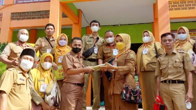 Kepala SMPN 14 Bandar Lampung, Abdul Khanif, M.Pd (tengah), menyerahkan surat tugas kepada tim survei untuk melakukan survei tempat tinggal…