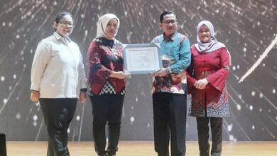 Kepala SMPN 14 Bandar Lampung, Wasiat, S.Pd., M.M.Pd (dua kanan), didampingi Kepala Dinas PPPA Bandar Lampung Maryamah, saat menerima piagam…
