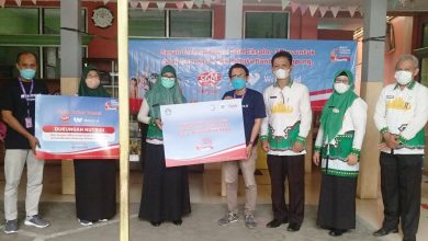Plt Kepala Disdikbud Bandar Lampng Hj. Eka Afriana (tiga kiri), secara simbolis menerima bantuan susu formula dari perwakilan Danone Indonesia,…
