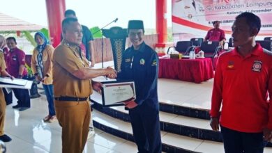 Bupati Lampung Selatan Nanang Ermanto, memberikan penghargaan kepada para pendamping dan relawan sosial di Lampung Selatan, Selasa, 12 Desember 2023.…