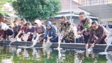 Rektor Prof. Lusmeilia, bersama jajaran, secara simbolis melepas ikan di kolam ikan FISIP, Jumat pagi, 28 Juli 2023. ISTIMEWA SMARTNEWS.ID…