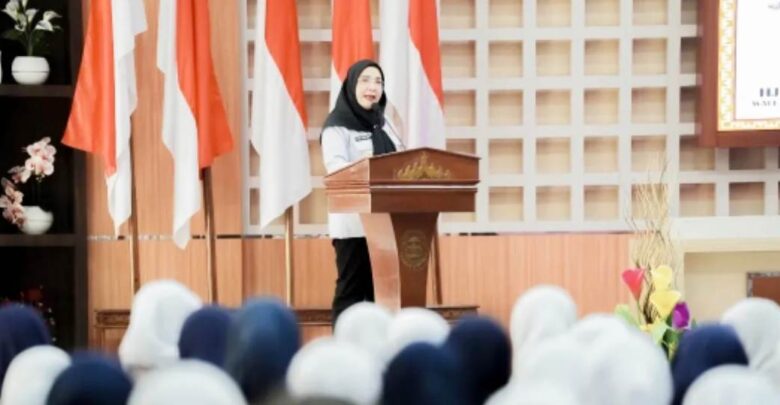 Wali Kota Eva Dwiana, saat memberikan sambutan pada pengukuhan Satgas Remaja Antinarkoba dan Kekerasan SMP, di Gedung Semergou Pemkot Bandar Lampung, Rabu, 24 Juli 2024. ISTIMEWA
